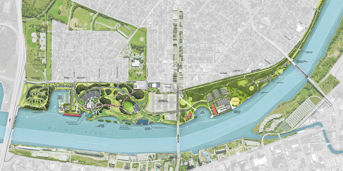 The Glass City Riverwalk is a transformative urban redevelopment initiative that is reshaping more than 100 acres of underutilized waterfront along both banks of the Maumee River in downtown Toledo. Extending from the Anthony Wayne Bridge (SR 2) to the Veterans’ Glass City Skyway (I-280), the project reconnects the city to its river through a continuous public realm that links Promenade Park, International Park, and Swan Creek. Envisioned as a catalyst for inclusive access, outdoor recreation, and community connection, the Riverwalk reestablishes the Maumee River as a defining civic asset.