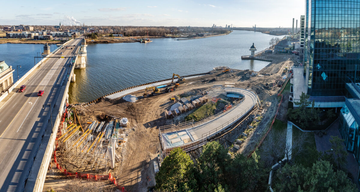 Our team is leading the design of the downtown segment, which includes nearly one mile of multi-use trails, two pedestrian bridges, and significant shoreline and utility infrastructure improvements. A defining feature of this phase is the Bend Bridge, a seven-span, cast-in-place concrete structure with a sweeping 180-degree curve that creates a memorable river crossing while connecting the Riverwalk to the MLK Jr. Bridge via fully ADA-compliant routes. The bridge’s concrete deck incorporates recycled glass, introducing a subtle, shimmering surface that reflects Toledo’s identity as the “Glass Capital of the World.”