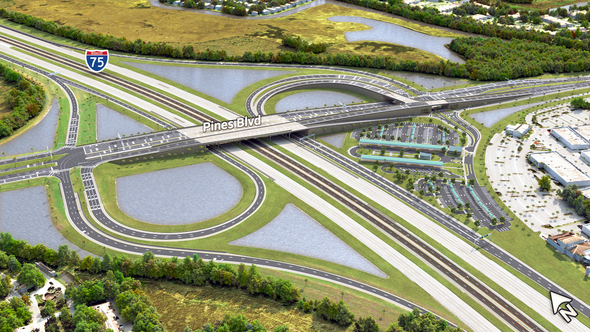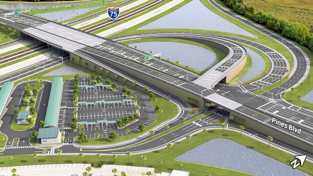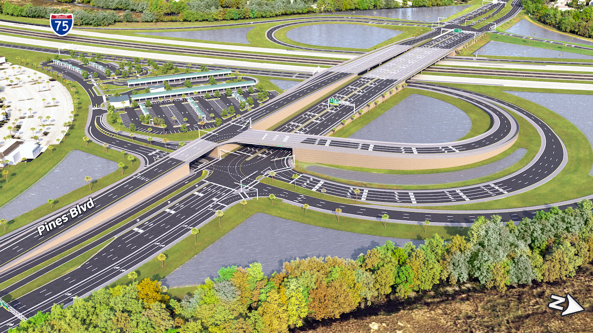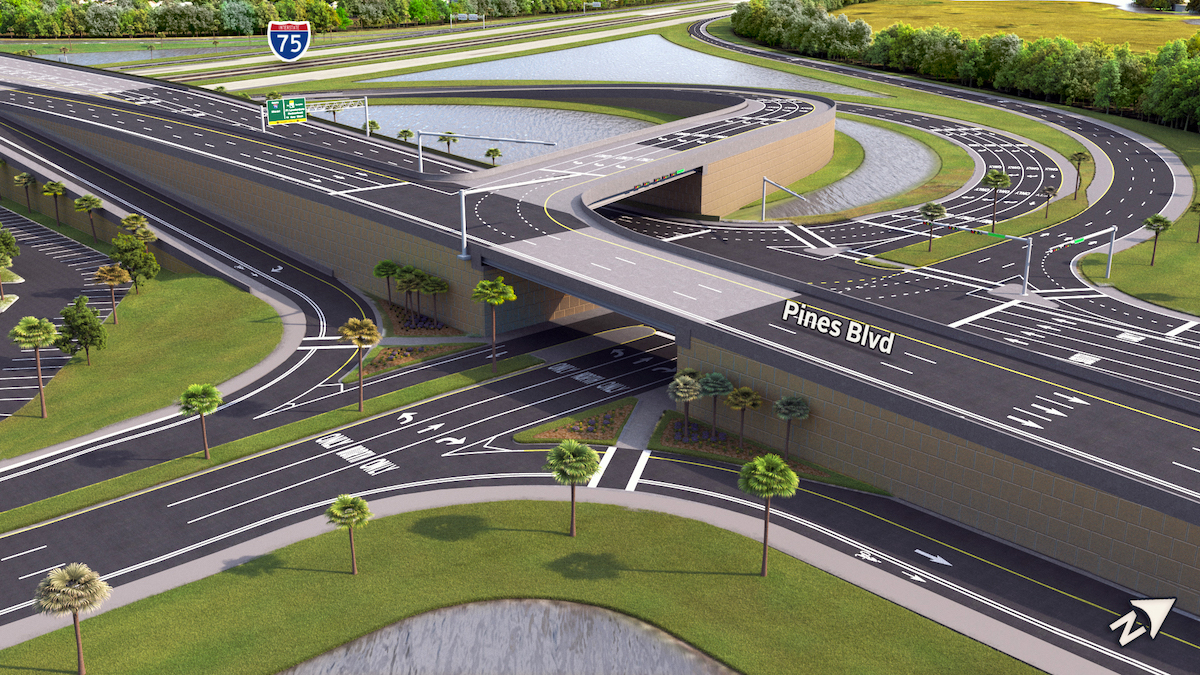 Our team was brought on by the Florida Department of Transportation (FDOT) to relocate the northbound-to-eastbound exit ramp at the I-75 and Pines Boulevard Interchange. This relocation was necessary to vacate the southeast quadrant for a planned Express Bus Hub and Park & Ride, while also addressing traffic demands, reducing congestion, and improving mobility, safety, evacuation routes, and truck access.