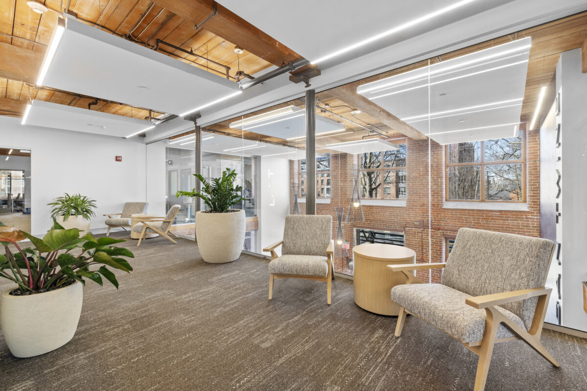 Following a comprehensive renovation in 1984, the 117,000-square-foot building was thoughtfully adapted for contemporary use and now accommodates a range of corporate office suites with flexible sizes and layouts. Interior spaces celebrate the building’s industrial origins, with exposed brick and timber framing complemented by large windows that flood the workspaces with natural light.