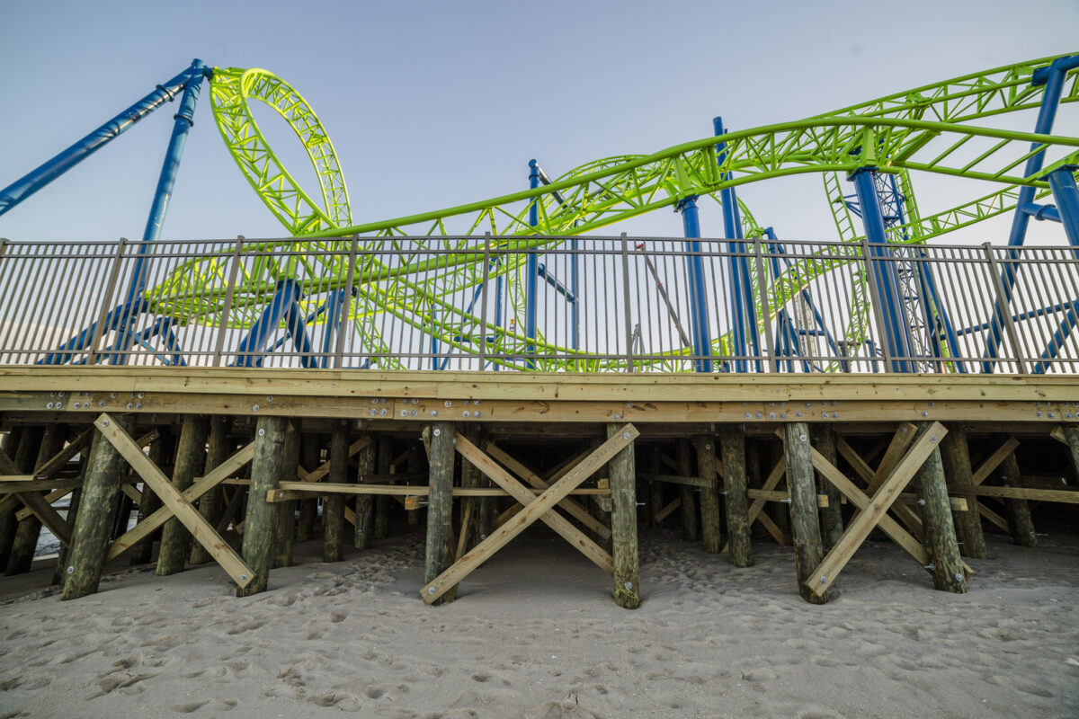 While the finished pier maintains the familiar character of a traditional boardwalk, its structure tells a different story. Beneath the surface, a system of concrete and steel elements provides the strength and stability needed to support a modern steel roller coaster while resisting wave forces, scour, and long-term coastal impacts.
