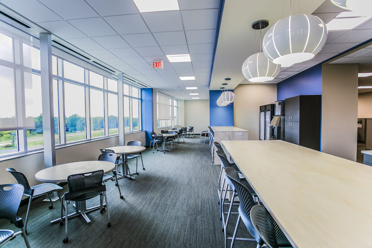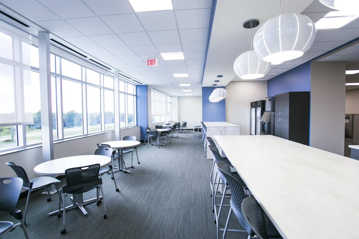 The two-story, 295,000-square-foot structure balances 150,500 square feet of research and development space with 144,500 square feet of office and support functions. An industrial aesthetic drives the design language, with expansive open areas, generous natural light through large glass installations, and exposed structural elements that honor the technical work happening inside. Every decision reinforced the same principle: the building should feel as inventive as the people who occupy it.