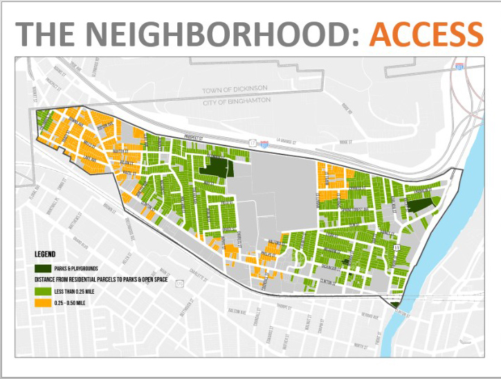 Colliers Engineering & Design worked with the City of Binghamton to prepare a NYS Brownfield Opportunity Area (BOA) Pre-Nomination Study and Nomination Study for the First Ward Neighborhood located on the west side of downtown. The study identified opportunities for commercial and industrial growth as well as the stabilization of the residential base by capitalizing on existing successes and programs within the 369 acre study area. A key objective of the planning process was to engage and involve a very active local community through stakeholder meetings with the neighborhood assembly and through interactive activities focused within the neighborhood. The study area was near the State University of New York (SUNY) Binghamton.