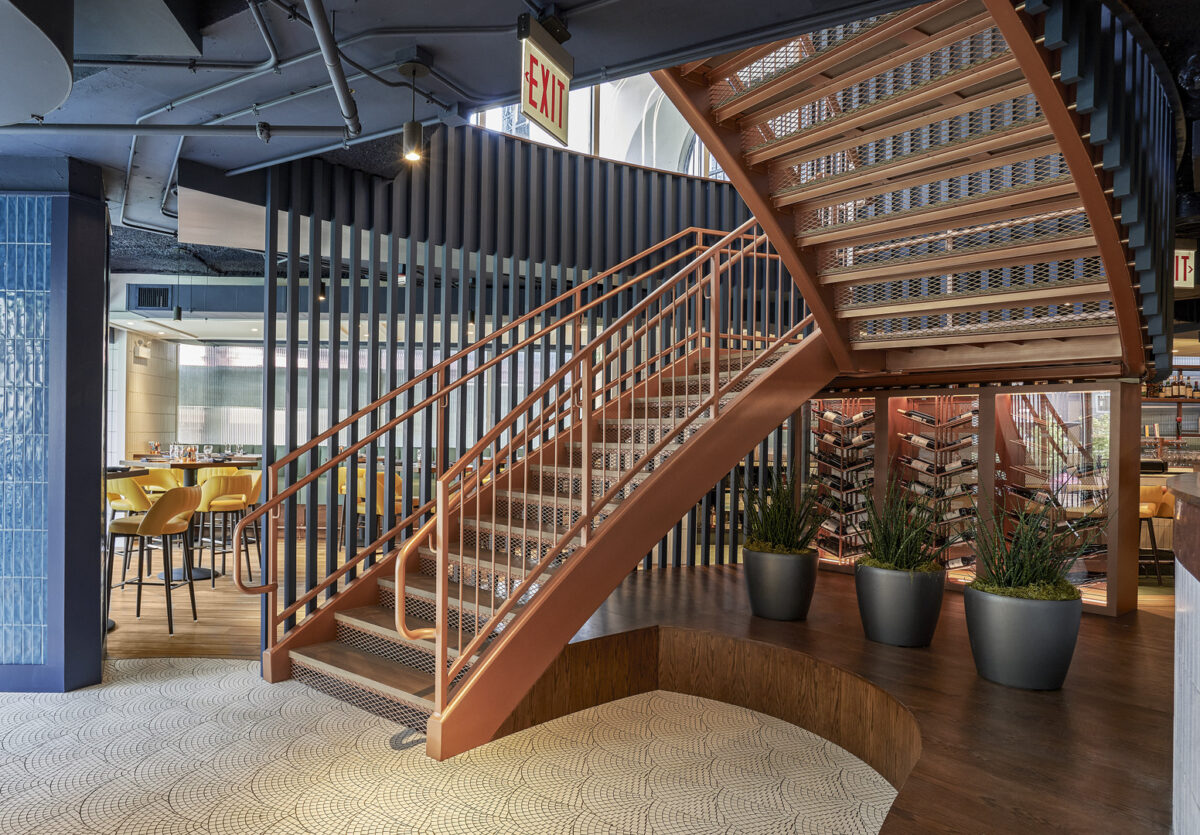 This new establishment brings upscale, casual New England charm to Chicago, featuring breathtaking riverfront views and inviting outdoor spaces at the Marina Towers. The design pays homage to the architectural significance of Marina City, locally called the “corncob buildings,” with an interior that embraces the building’s signature curves. Colors and light fixtures emit a bright, modern Eastern Seaboard ambiance. A notable highlight includes a striking two-story copper staircase with integrated slats, seamlessly connecting the lower-level bar to the sushi and oyster bar upstairs.