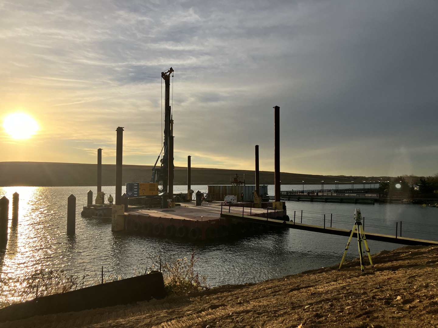 The work included installation of drilled shafts with permanent steel casing and rock sockets, steel pipe piles, and driven timber piles to support the overall structure. These elements form the foundation for a reinforced concrete floating wave attenuator, aluminum floating docks with timber decking, and a gangway system that connects passengers safely to the ferry.