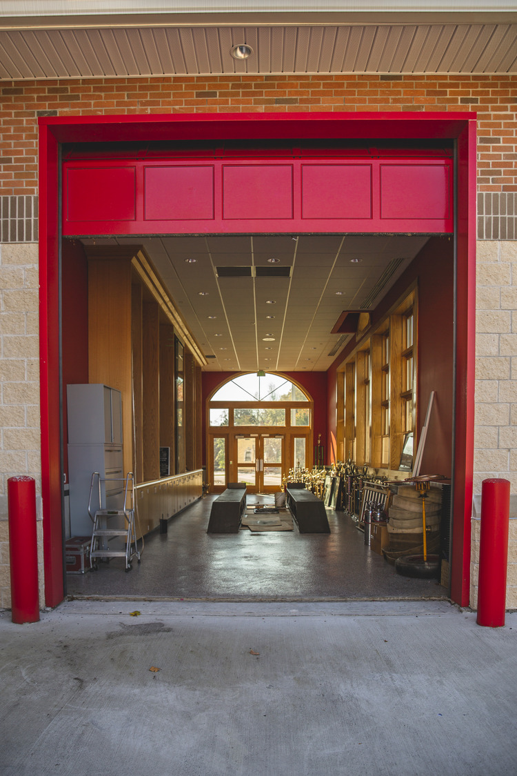 The structural system consists of CMU bearing walls supporting precast plank floors and open web steel truss roof framing, creating a durable and efficient framework suited to the building’s operational demands. The facility includes a seven-bay apparatus garage, first-floor offices and locker rooms, and a mezzanine level for sleeping, dining, and training.