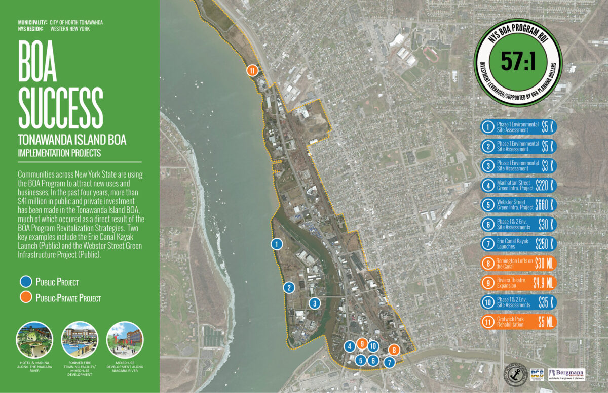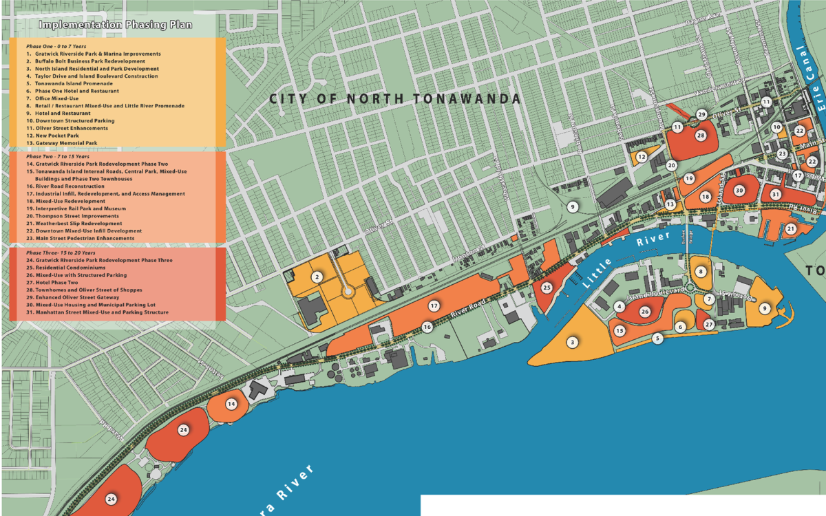 The City of North Tonawanda engaged our firm to complete a Step 2 Nomination Study through New York State’s Brownfield Opportunity Area program, covering Tonawanda Island, portions of the River Road corridor, and downtown North Tonawanda. The study delivered a detailed analysis of existing conditions, a master plan for the area, and a series of recommendations and action items to guide revitalization. It became the foundation for everything that followed.
