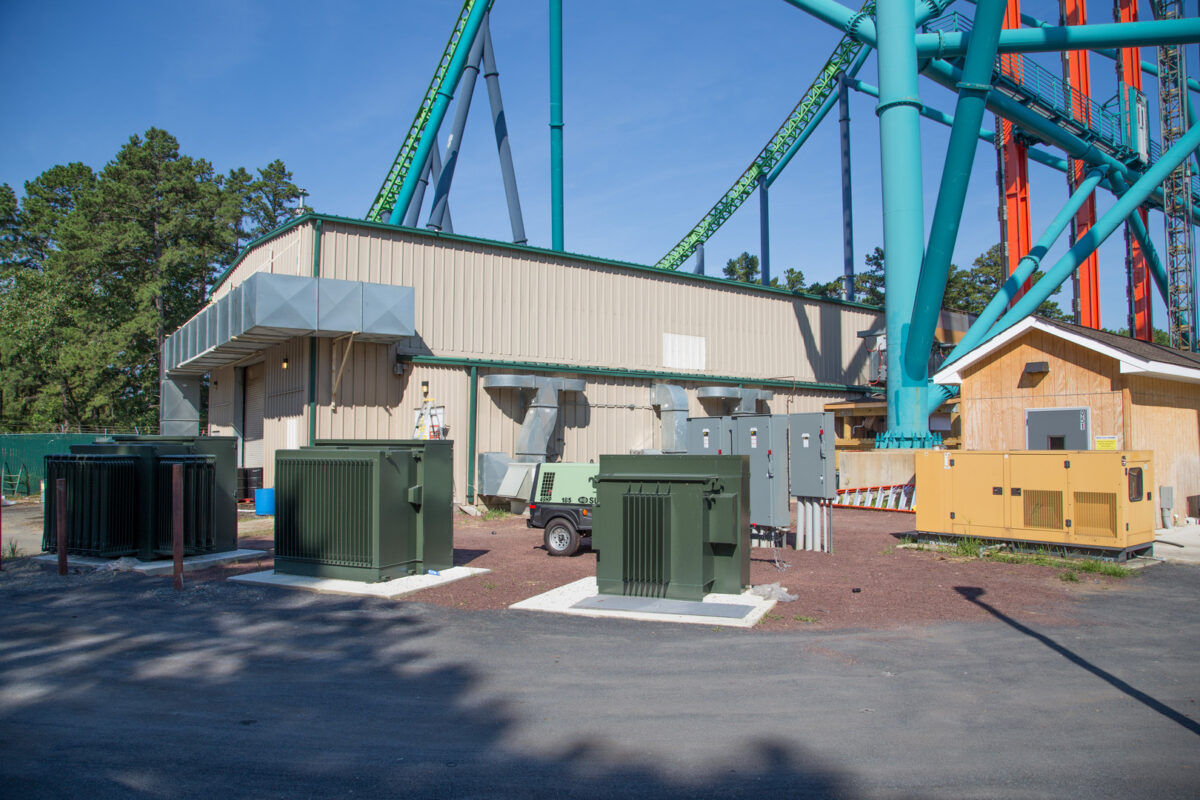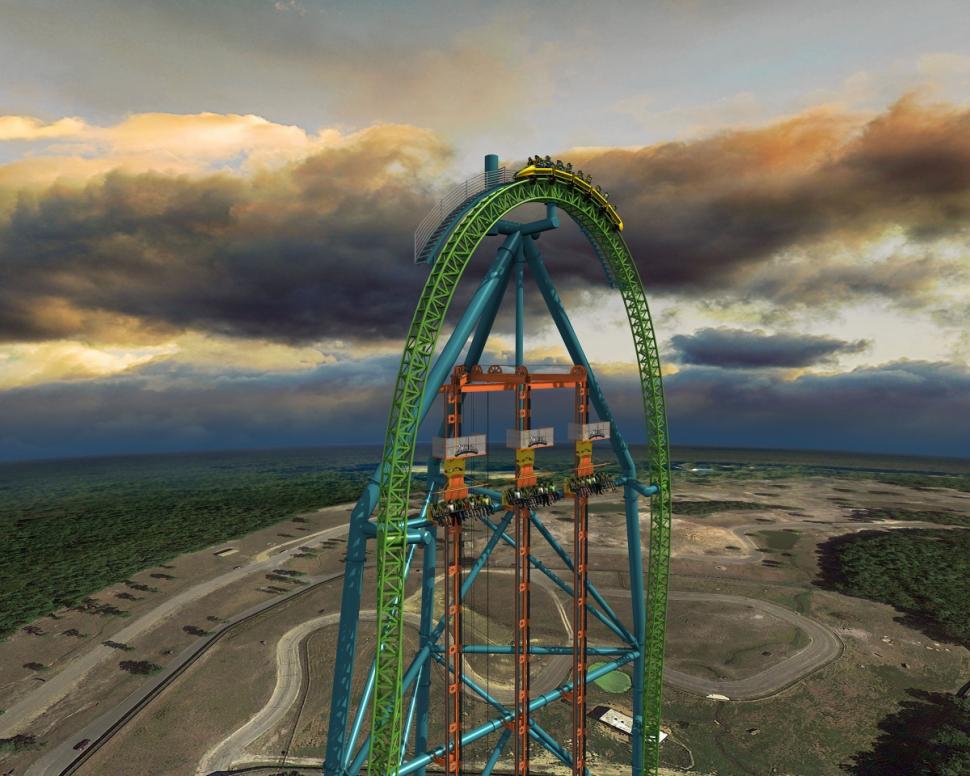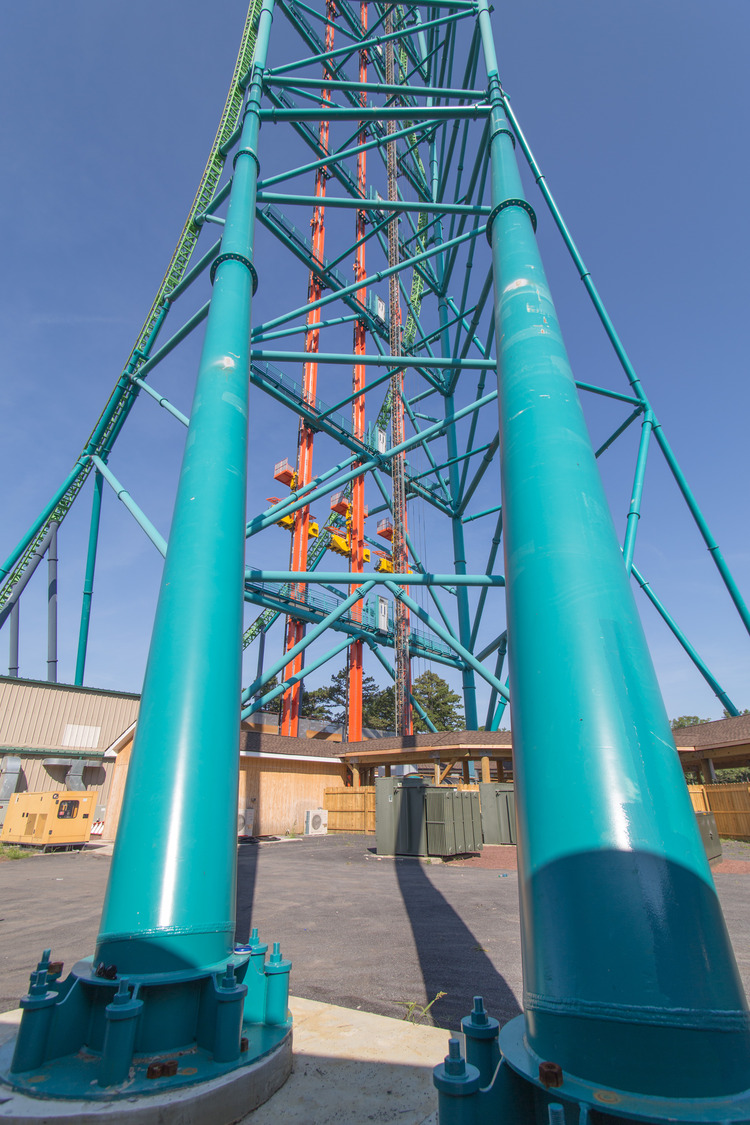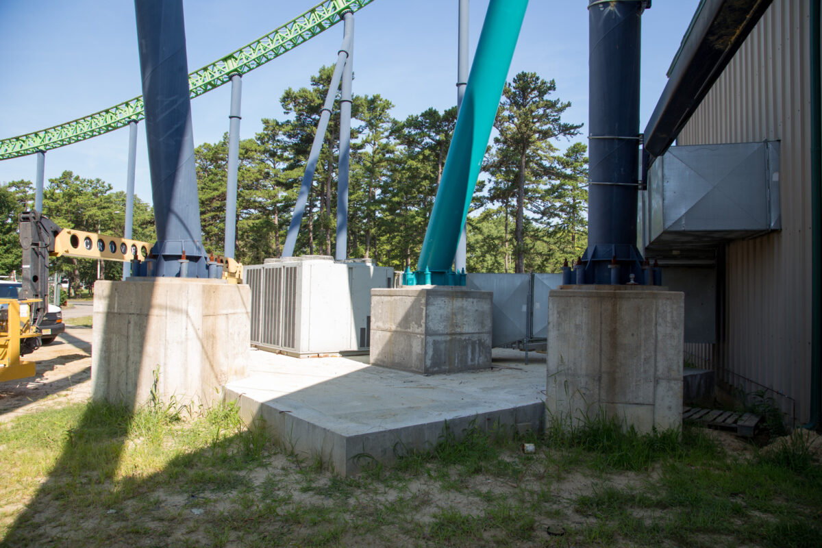 In order to add the Zumanjaro: Drop of Doom ride to the face of the Kingda Ka roller coaster at Six Flags Great Adventure, Colliers Engineering & Design’s professionals provided structural engineering, civil/site engineering, permitting, land survey, and construction stakeout services for the construction of new footings and support beams to reinforce the tower structure of the Kingda Ka ride. Zumanjaro is currently the tallest drop ride in the world at 415 vertical ft. The drop ride tracks are attached to the face of the existing steel tower that supports the vertical loop of the Kingda Ka roller coaster, an innovative design solution that creates two rides within a single space.
