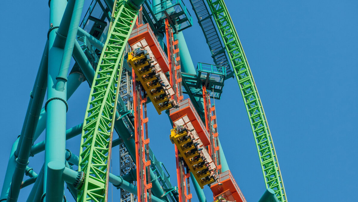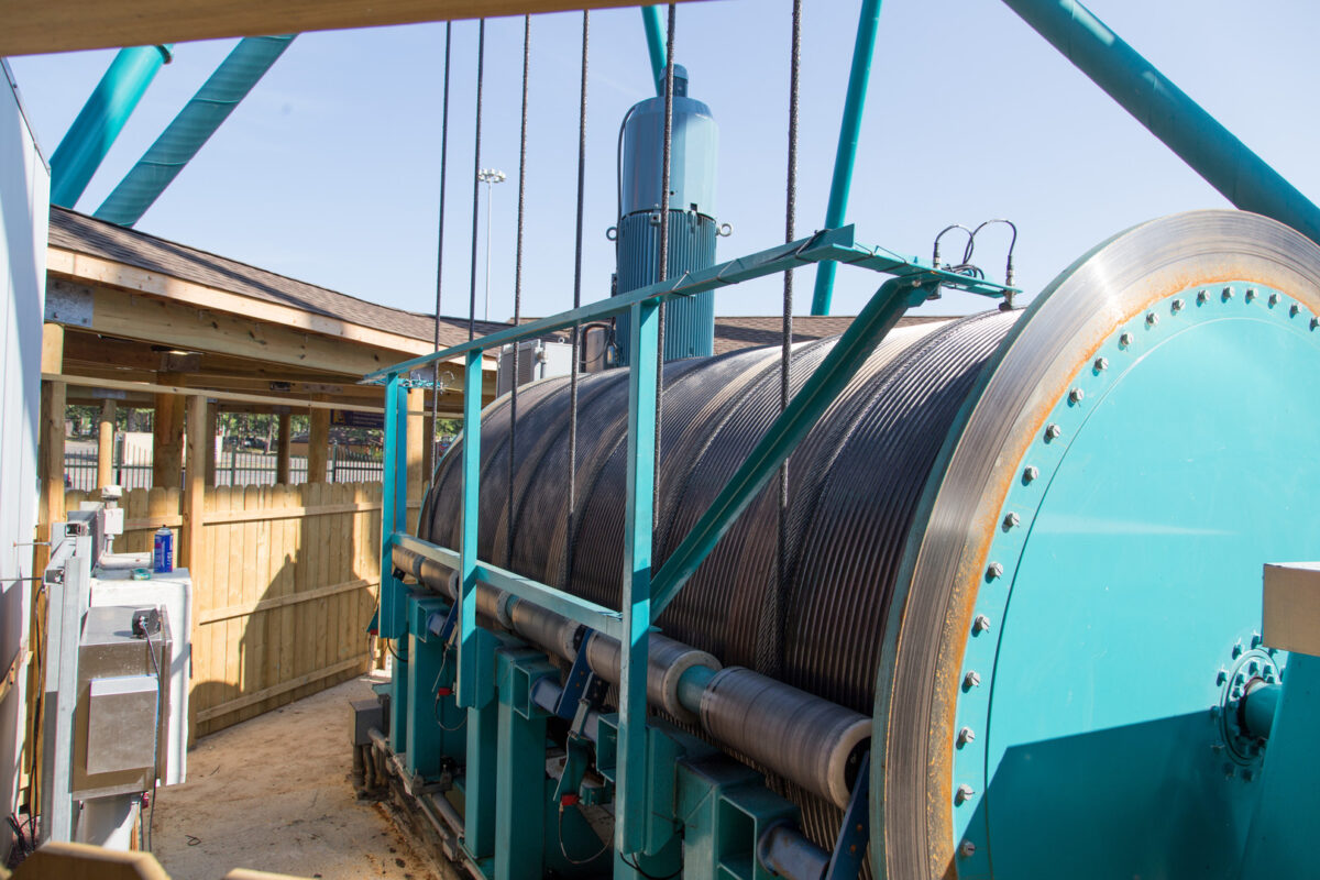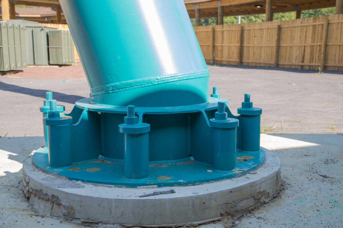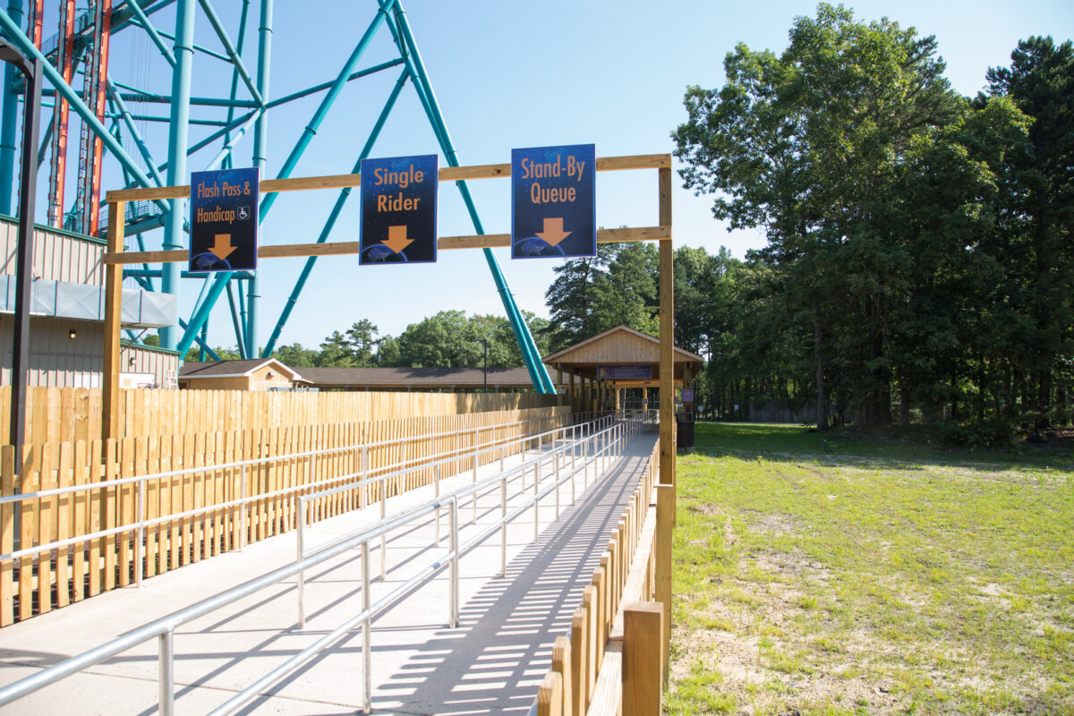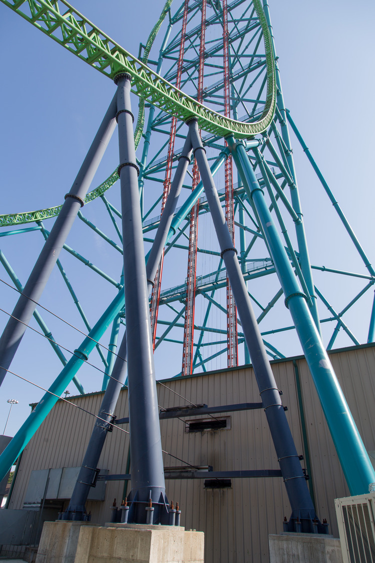 Colliers Engineering & Design’s structural engineers analyzed the loads from the new required columns and structures to develop a final design that allowed the new footings to fit within and on top of the existing tower footings, while staying within the limits of the site’s soil properties and applicable ride and building codes. The project also included close coordination with Six Flags planners to design a walkway leading to the ride, attracting patrons from the park’s midway and funneling them into queues. A portion of this walkway is covered by a long protective structure to shield riders waiting in line. This queue structure design includes a pneumatically-powered retractable roof structure that is synched to the ride.