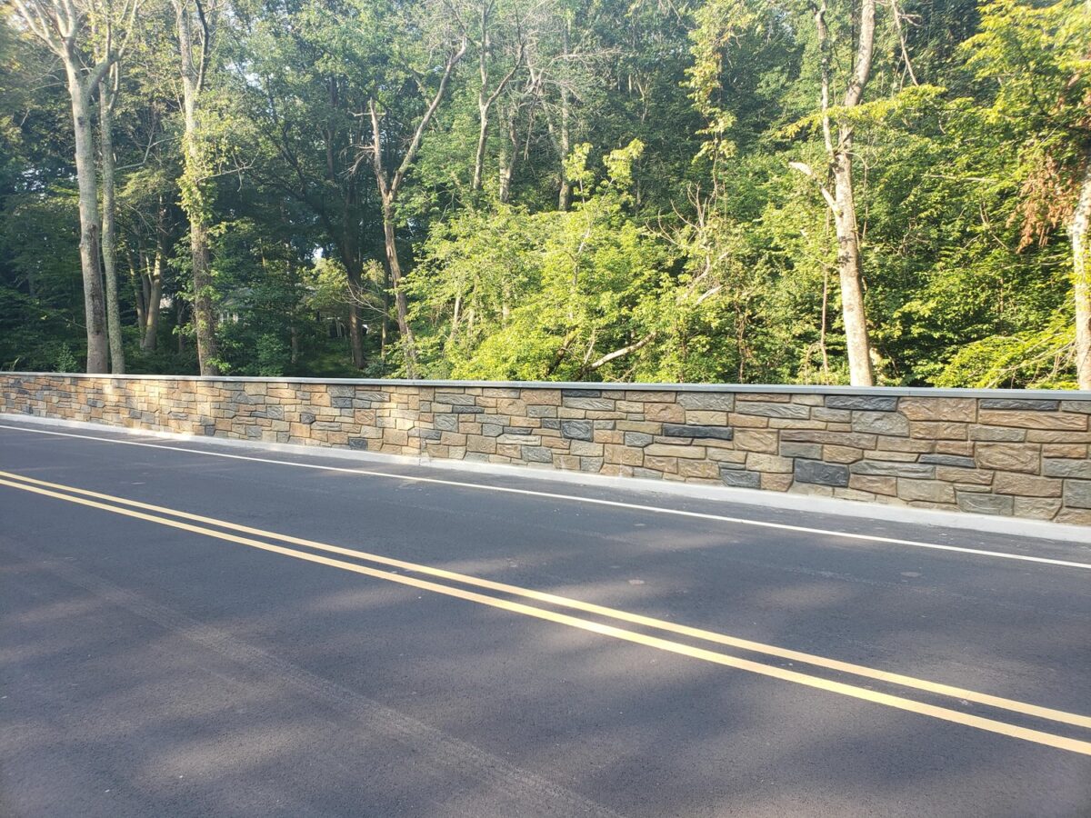 Functionality alone doesn’t make a good bridge. Holmes Mill Road runs through the rural landscape of Upper Freehold Township, where a stark concrete box would feel out of place. Our professionals designed a concrete form-liner with the appearance of rubble stone on all exposed concrete surfaces, giving the new structure a visual character that fits the agricultural and wooded surroundings rather than announcing itself as a piece of highway infrastructure.