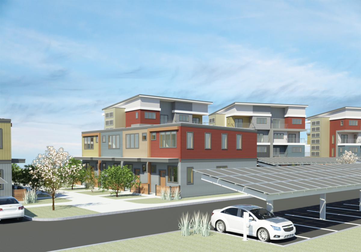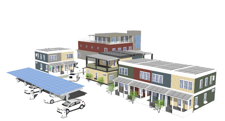 The community includes eight townhomes and four condominium buildings, each designed to operate on solar electric systems and high-efficiency heat pump technology. Photovoltaic panels integrated into the rooftops power the units, allowing residents to rely on renewable energy while reducing long-term costs and environmental impact.