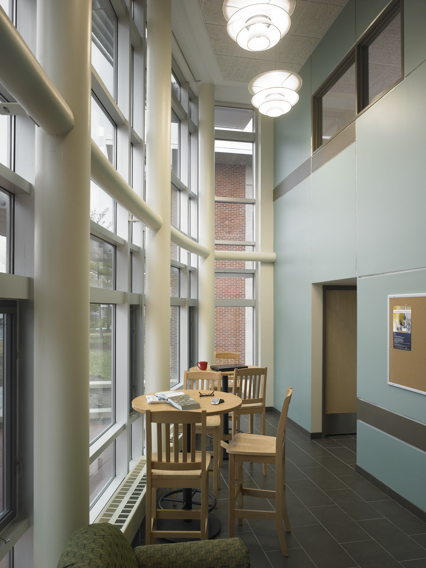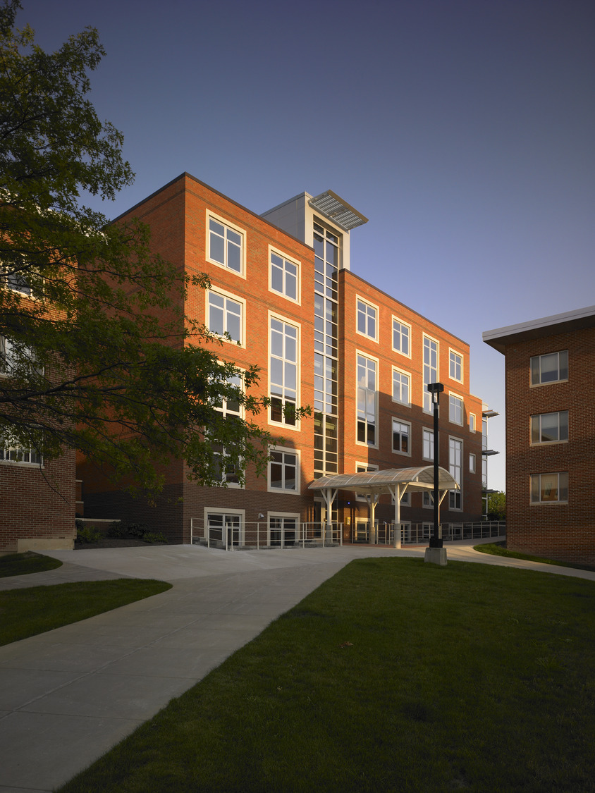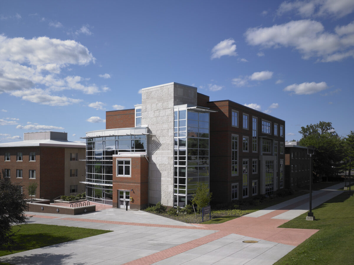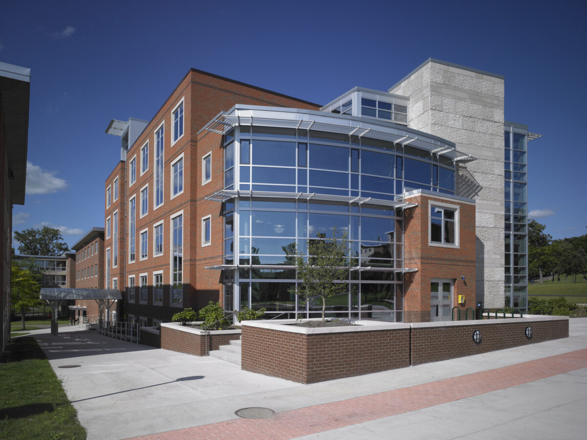 Our affiliates at Bergmann provided full architectural and engineering design services for the new 84-bed residence hall. This project, which won the 2011 AIA Rochester Chapter Design Award, consisted of a limestone clad stair tower that anchors the building at the southeast corner, visually terminating the approach into the north village quad. The four-story building has ten double-dwelling units on each floor with a shared bathroom for each. A single residence assistant unit is located on each floor, as well as a lounge space, trash room, laundry facility and restrooms/showers. A curving glass and metal transparent form to the south serves as the entrance lobby, showcasing the open study lounges.