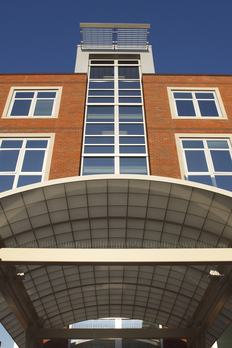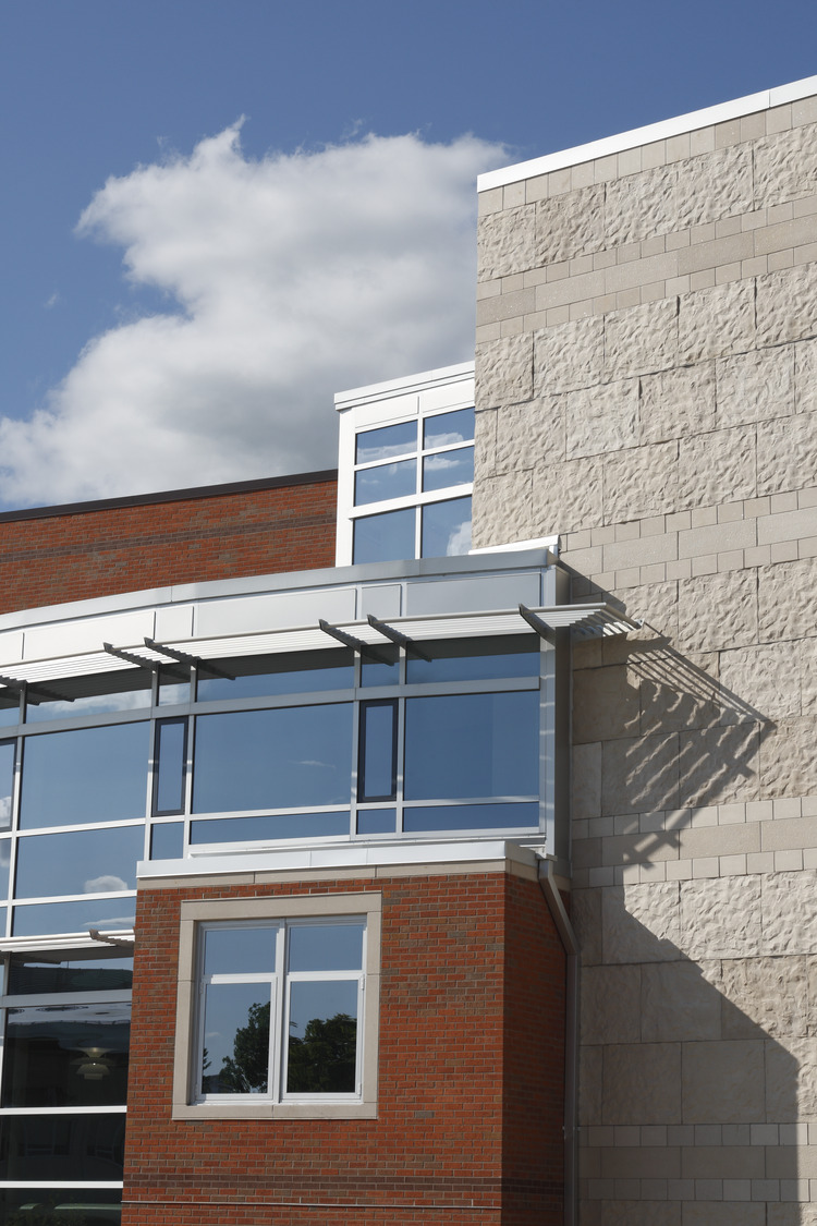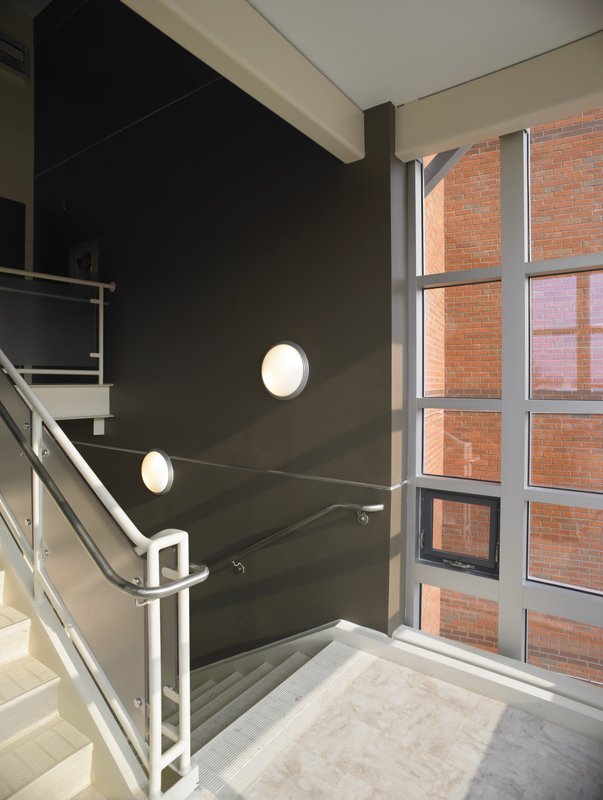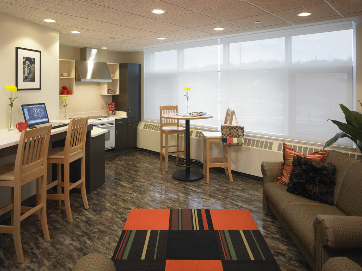 Our affiliates at Bergmann provided full architectural and engineering design services for the new 84-bed residence hall. This project, which won the 2011 AIA Rochester Chapter Design Award, consisted of a limestone clad stair tower that anchors the building at the southeast corner, visually terminating the approach into the north village quad. The four-story building has ten double-dwelling units on each floor with a shared bathroom for each. A single residence assistant unit is located on each floor, as well as a lounge space, trash room, laundry facility and restrooms/showers. A curving glass and metal transparent form to the south serves as the entrance lobby, showcasing the open study lounges.