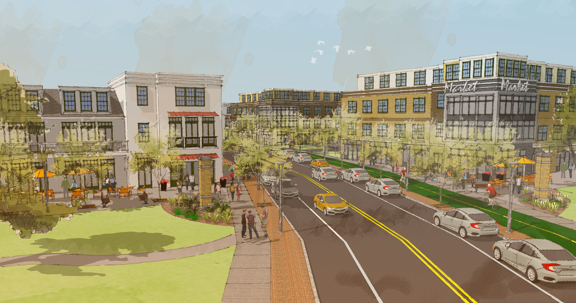 Our team developed a comprehensive concept plan supported by streetscape enhancements and aerial renderings to illustrate the transformation of the district. The plan incorporates defined place types, street concepts, and coordinated development patterns to guide future investment and implementation.