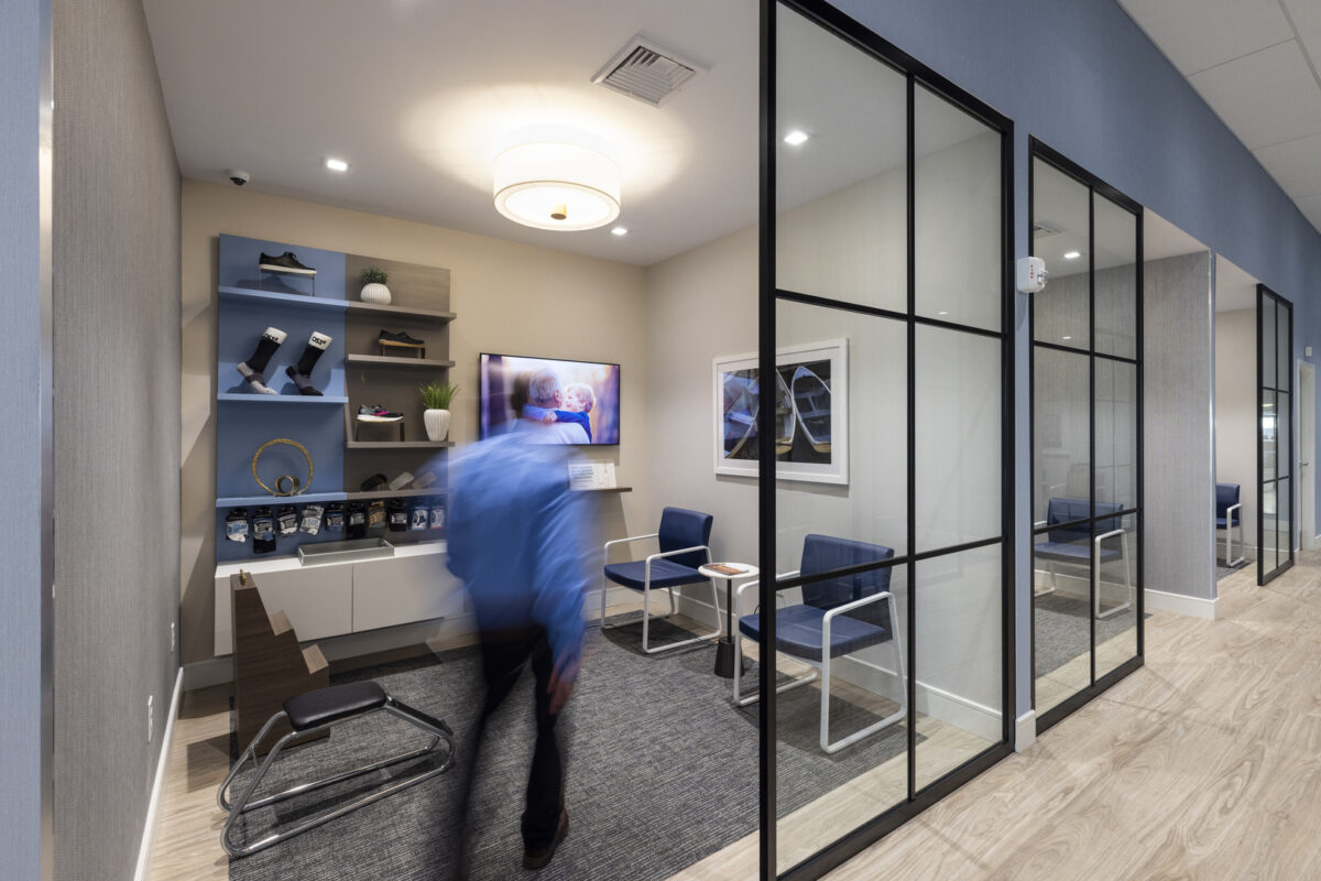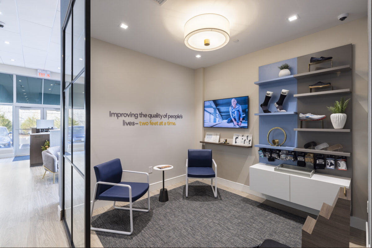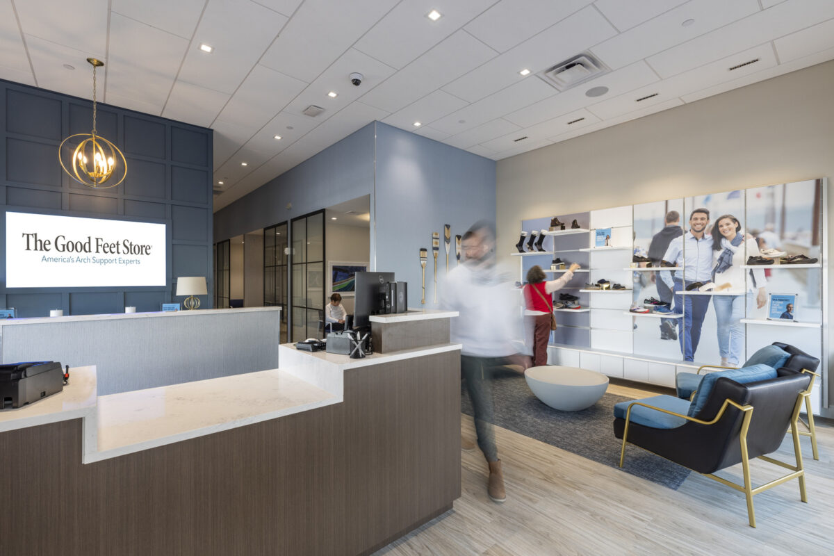 The Good Feet Store isn’t your typical retail environment. Our design elevates the brand’s brick-and-mortar presence into a sophisticated wellness space that mirrors high-end hospitality venues. Drawing inspiration from luxury hotels and modern healthcare facilities, we crafted an atmosphere that transforms the shopping experience through thoughtful architectural elements.