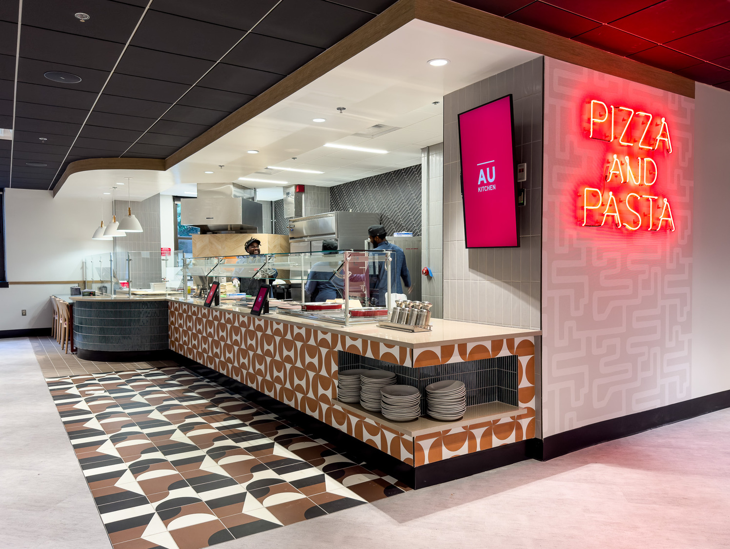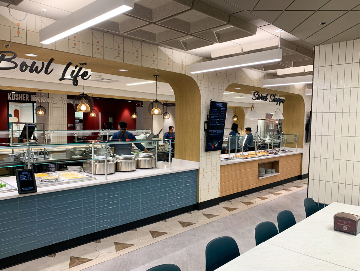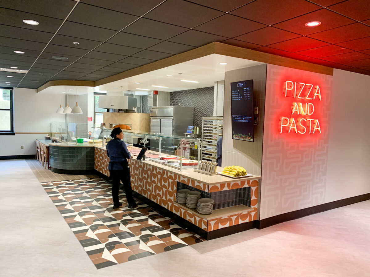 The Terrace Dining Room (TDR), American University’s largest dining facility, has been transformed into an industry-leading space that combines modern design with a variety of independent dining concepts. Driven by student feedback, which highlighted a desire for a more engaging and dynamic dining experience, the redesign reimagines TDR as a contemporary, fast-casual restaurant rather than a traditional dining hall.