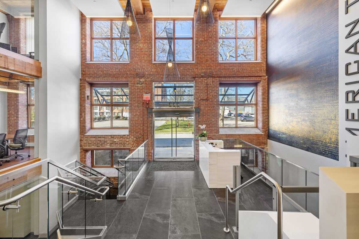 Following a comprehensive renovation in 1984, the 117,000-square-foot building was thoughtfully adapted for contemporary use and now accommodates a range of corporate office suites with flexible sizes and layouts. Interior spaces celebrate the building’s industrial origins, with exposed brick and timber framing complemented by large windows that flood the workspaces with natural light.