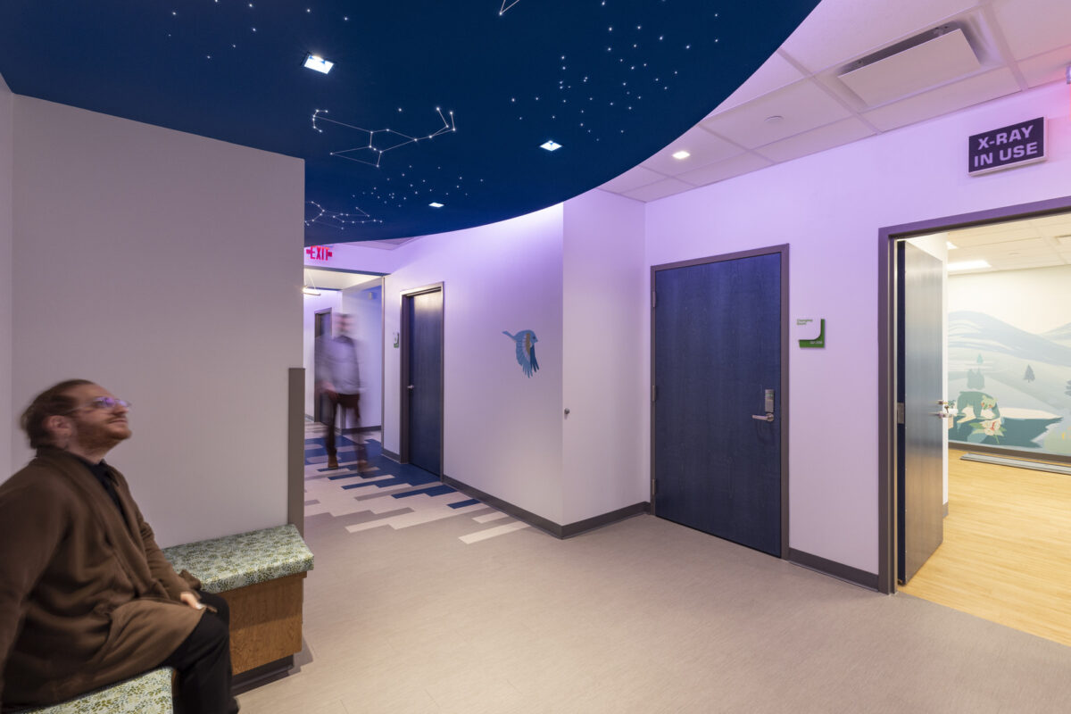 The inspiration began with a simple priority: increasing patient and staff comfort and confidence. Our designers wove biophilic elements throughout the space, drawing from natural themes of water, earth, and sky connected by a common trail. Integrated lighting enhances the ambiance of each zone and guides young patients along their journey, helping to engage them and ease the anxiety that medical visits so often bring. The color palette, derived from the hospital’s base colors, reinforces the natural feel, while specialty lighting elements including fiber optics that create constellations in the sky zone add a sense of wonder to what could otherwise be a clinical experience.