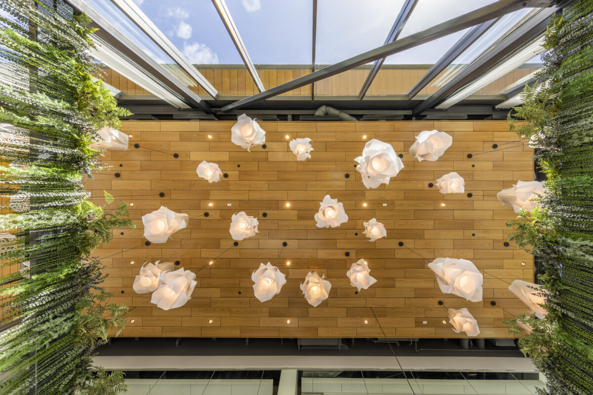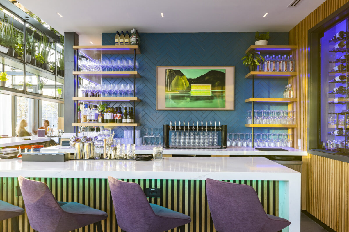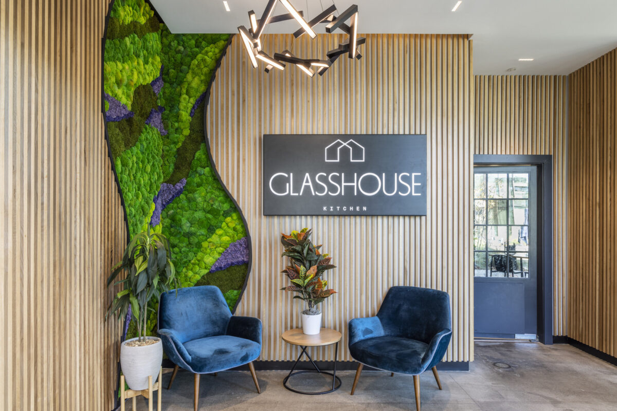Our team of architects and interior designers collaborated to create a visually striking space that complements the brand’s focus on sustainability and ingredient integrity. From the moment guests enter, natural elements blur the line between interior and outdoors. The expansive windows ensure the connection between diners and their food’s roots is never lost, no matter where they’re seated. Glasshouse Kitchen engages employees on the corporate campus while fostering a sense of community and connection with the surrounding area.
