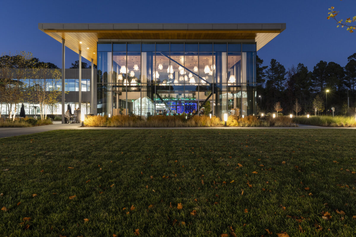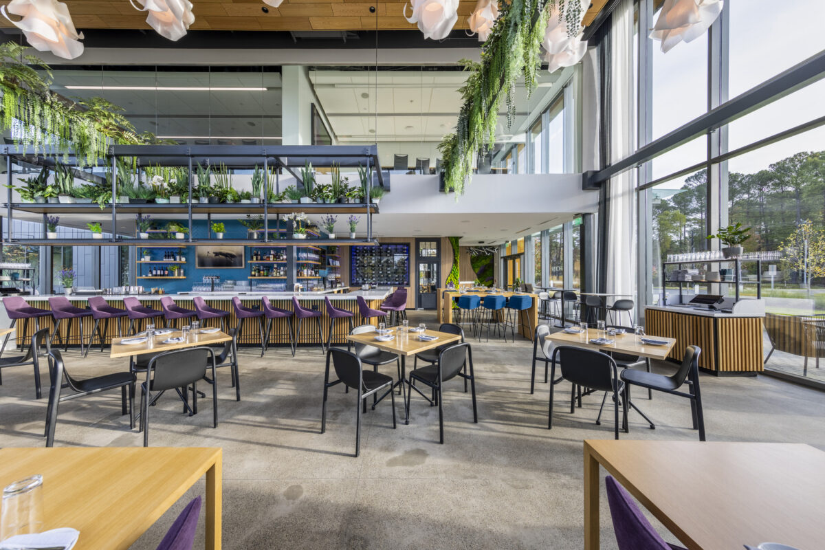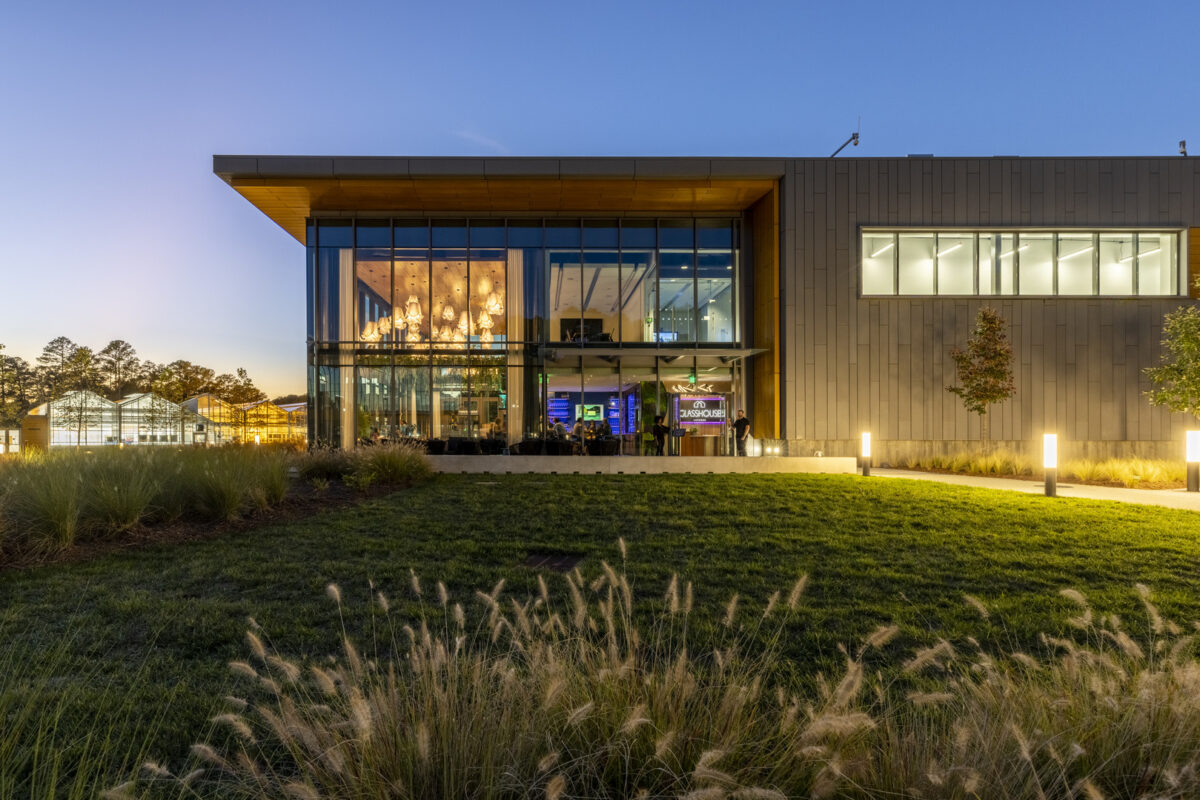Glasshouse Kitchen was designed to provide restaurateur Chris Borreson with a venue that celebrates the freshness and quality of its cuisine. Situated on a corporate campus in the heart of the Research Triangle region, known for its agricultural technology innovation, the restaurant offers a unique dining experience that balances elegance and familiarity. Natural light pours through expansive windowed walls, connecting diners with the surrounding campus and the origins of their food.
