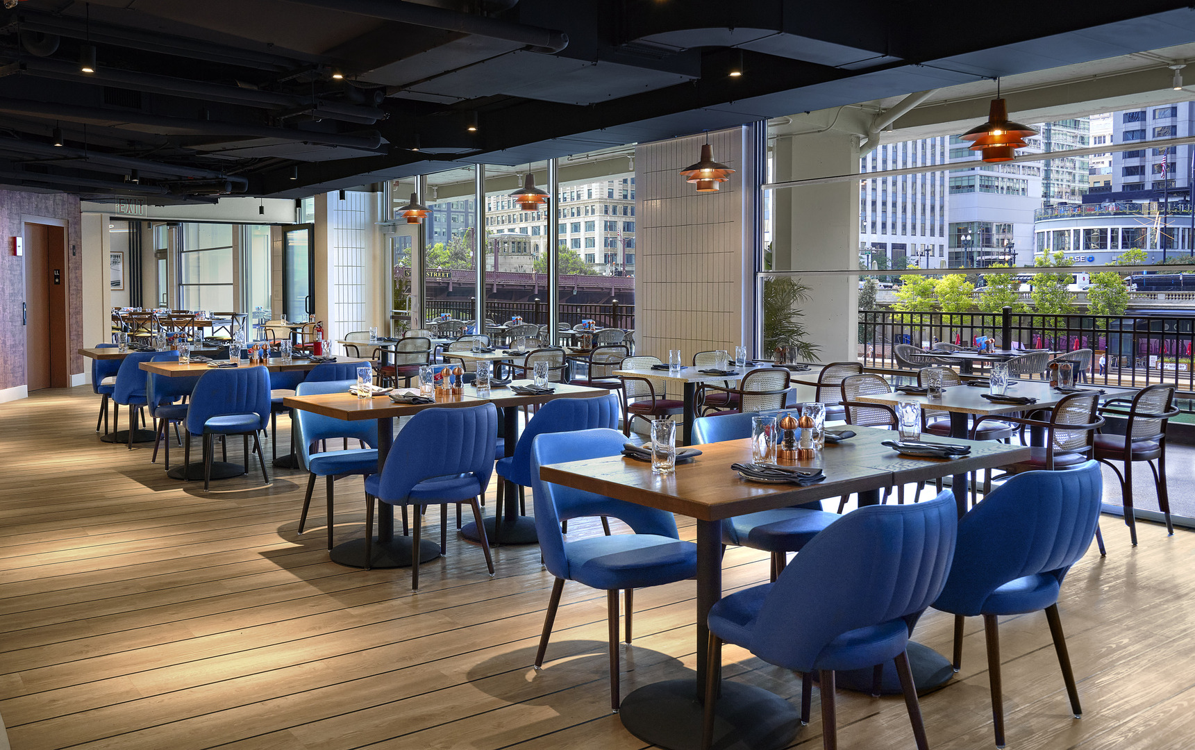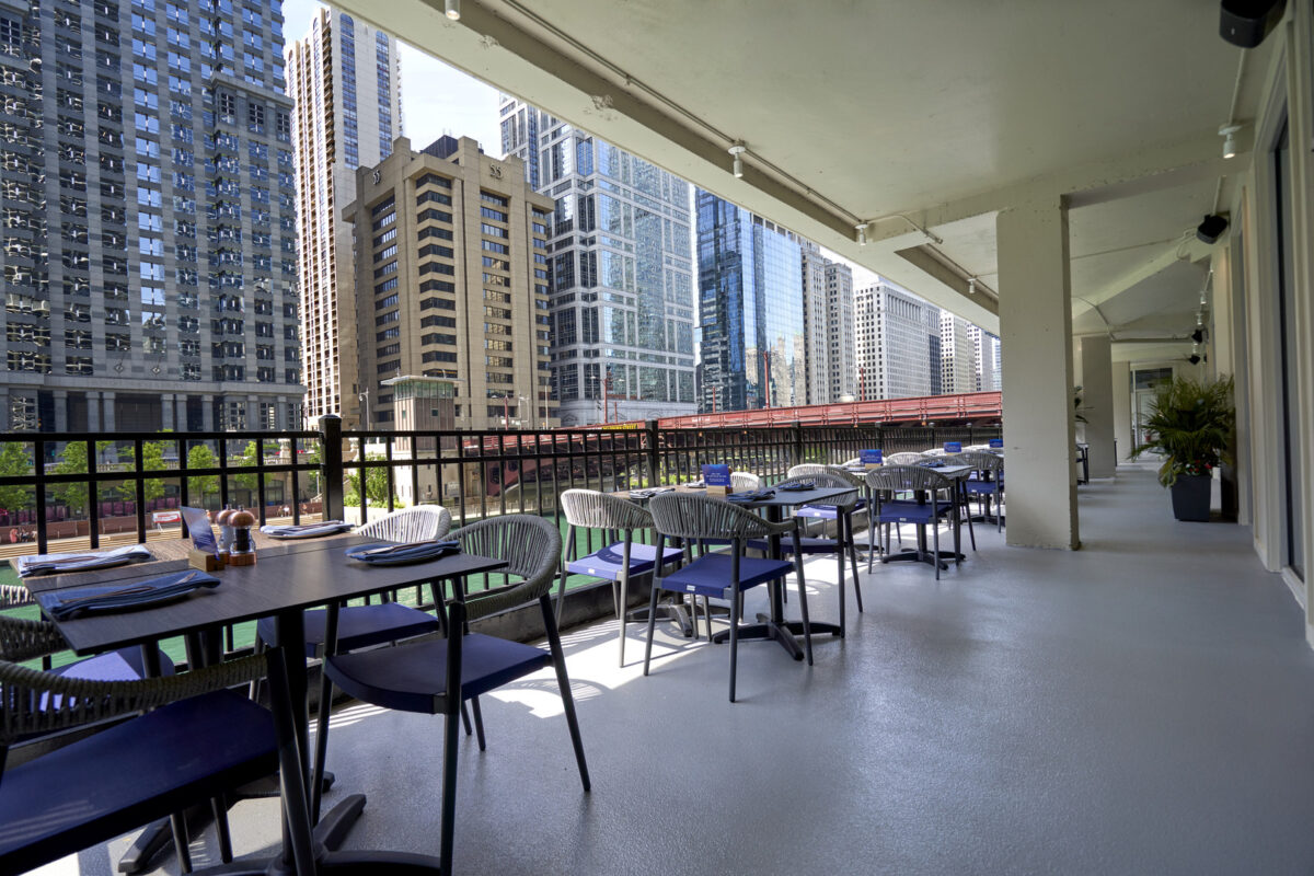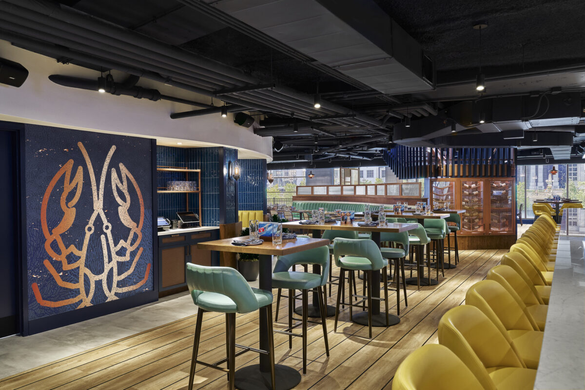 This new establishment brings upscale, casual New England charm to Chicago, featuring breathtaking riverfront views and inviting outdoor spaces at the Marina Towers. The design pays homage to the architectural significance of Marina City, locally called the “corncob buildings,” with an interior that embraces the building’s signature curves. Colors and light fixtures emit a bright, modern Eastern Seaboard ambiance. A notable highlight includes a striking two-story copper staircase with integrated slats, seamlessly connecting the lower-level bar to the sushi and oyster bar upstairs.