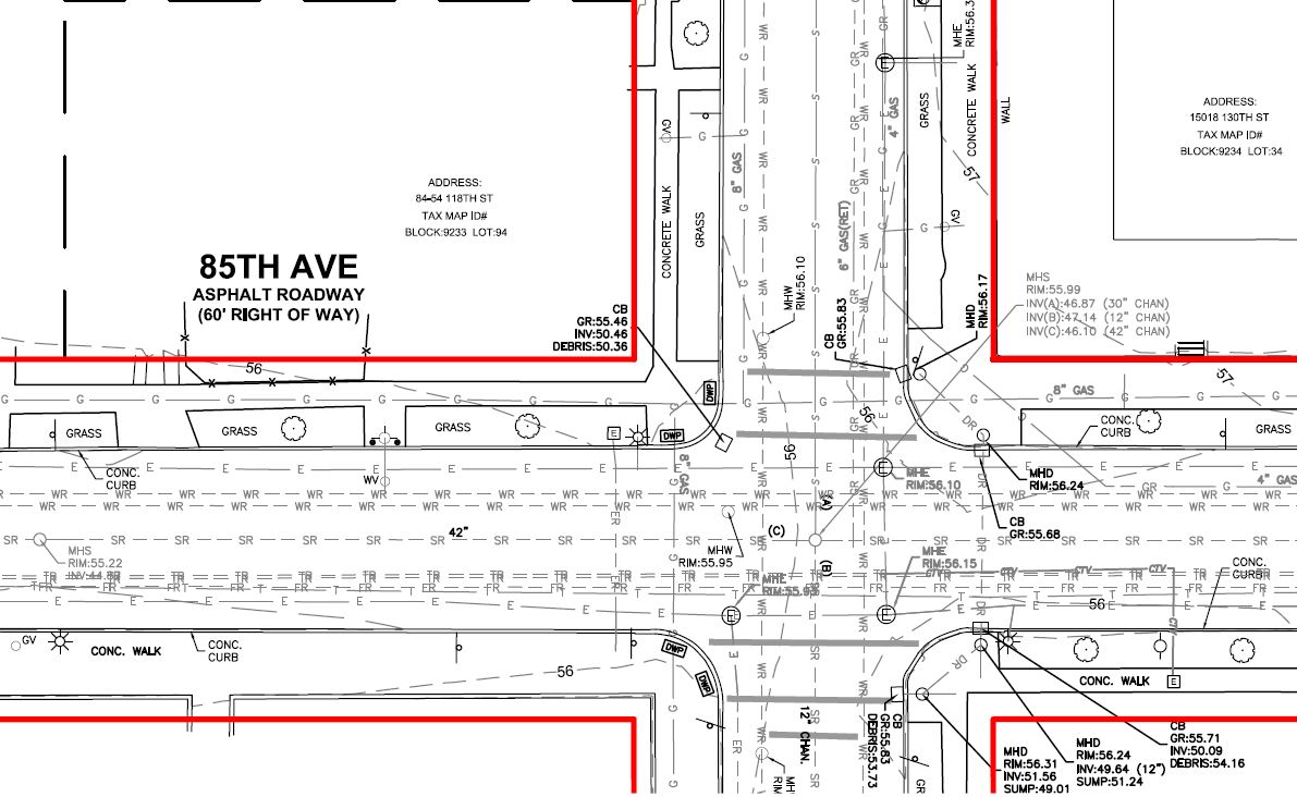 Colliers Engineering & Design provided land survey services, including a ground-based topographic survey within the street right-of-way, to prepare pre-design mapping for a utility installation in the Kew Gardens neighborhood of Queens. Additional requirements included running horizontal and vertical survey control, locating all visible utilities and utility mark-outs, and performing sewer and storm structure investigations. Our surveyors also provided subsurface utility engineering services, including the investigation and mark-out of existing underground utilities.