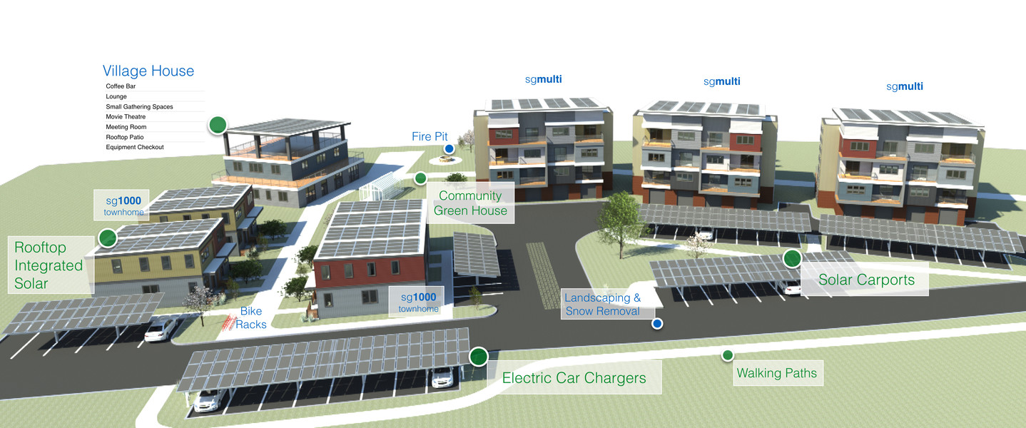 The community includes eight townhomes and four condominium buildings, each designed to operate on solar electric systems and high-efficiency heat pump technology. Photovoltaic panels integrated into the rooftops power the units, allowing residents to rely on renewable energy while reducing long-term costs and environmental impact.