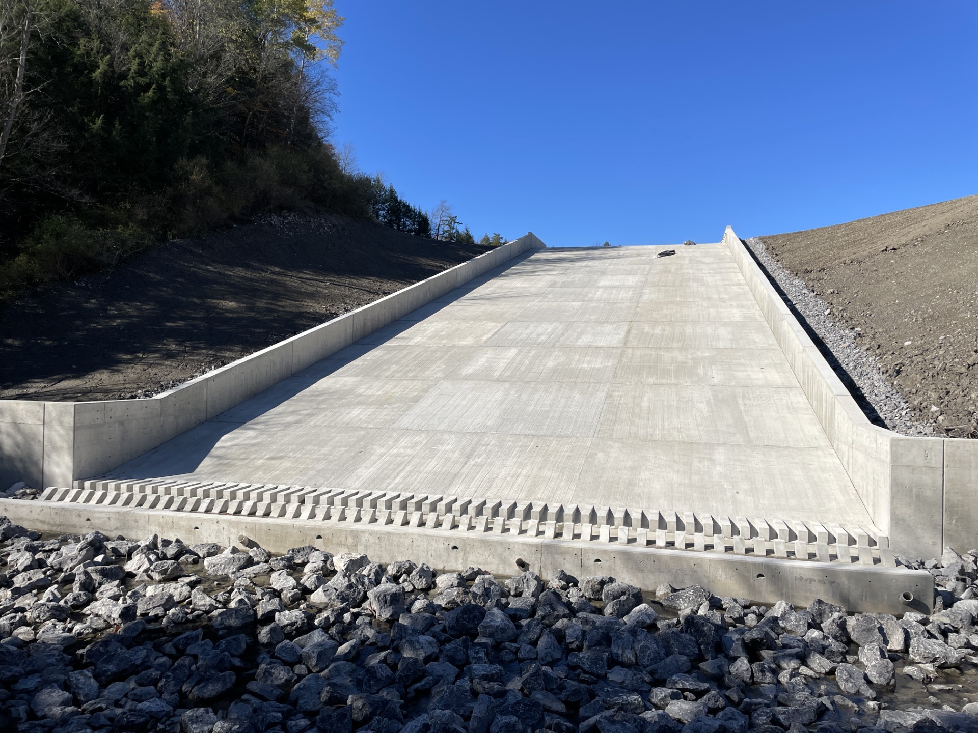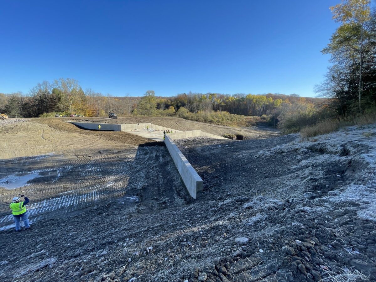 Working under the direction of the U.S. Army Corps of Engineers Buffalo District, our team developed a solution focused on long-term resilience. The existing earthen spillway was replaced with a reinforced concrete structure, increasing hydraulic capacity and eliminating the conditions that led to overtopping and erosion.